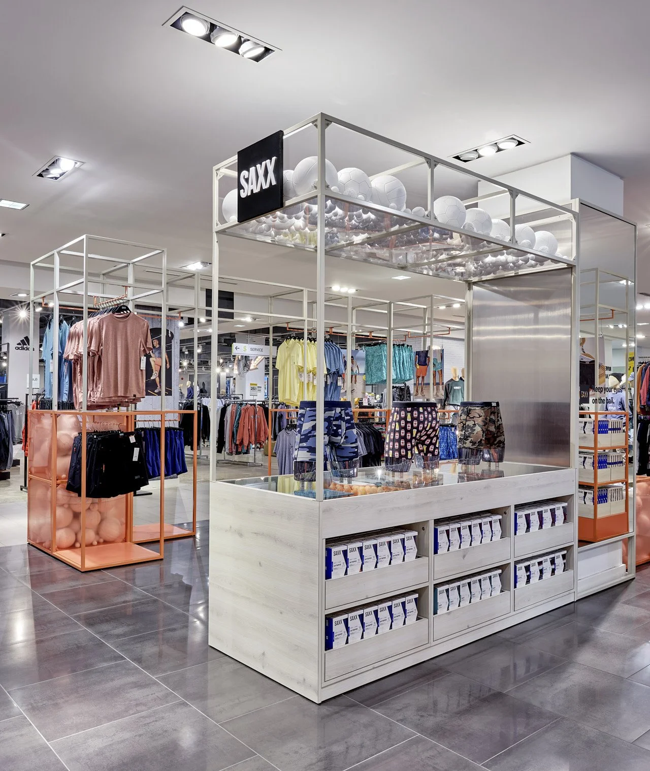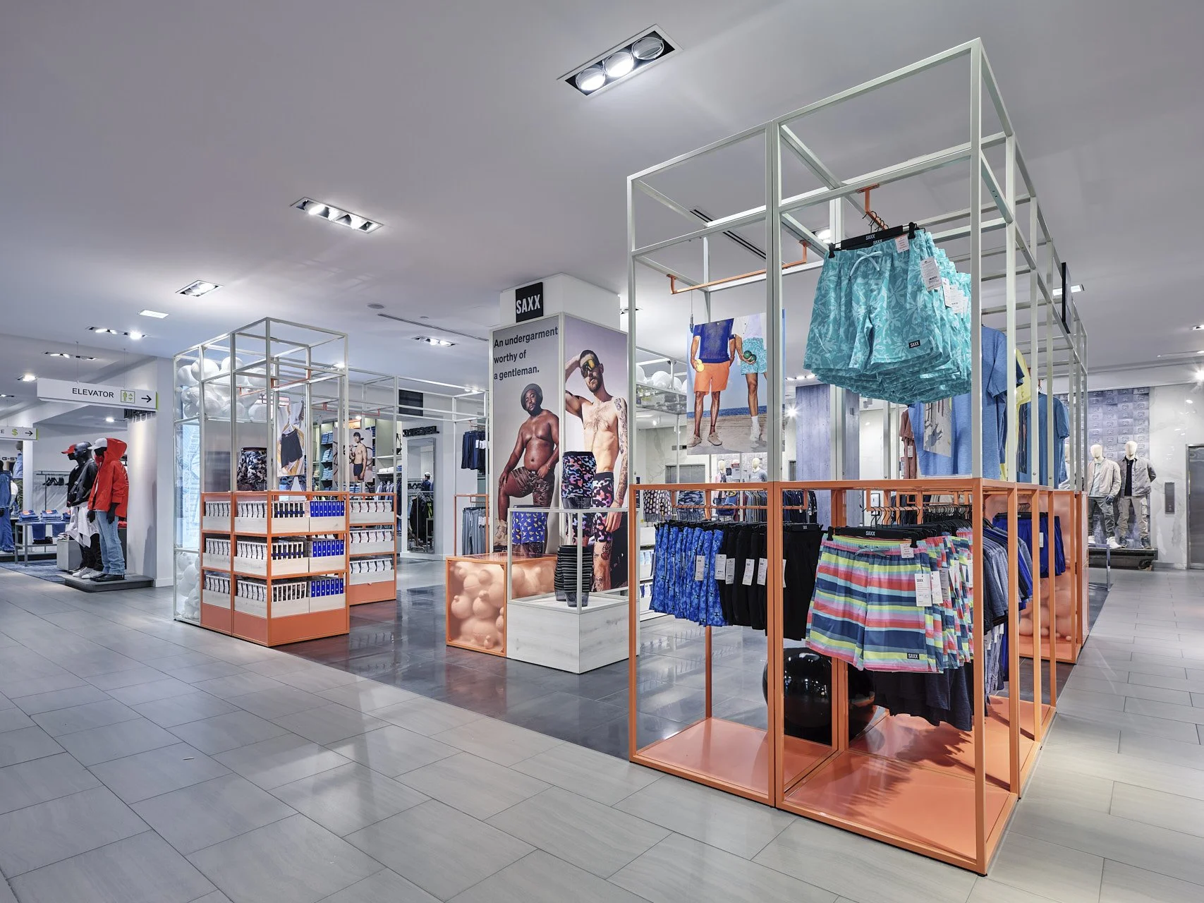SAXX LAUNCED IT’S FIRST IMMERSIVE IN STORE EXPERIENCE IN THE HUDSON’S BAY FLAGSHIP LOCATED IN DOWNTOWN TORONTO IN 2023. THE CONCEPT IS IN A 400-SQUARE-FOOT SPACE SHOWCASING INNOVATIVE UNDERWEAR FROM EVERYDAY TO ATHLETIC PERFORMANCE AND EXPANDED APPAREL COLLECTIONS. KEY FEATURES OF THE CONCEPT AREA INCLUDE: A DECONSTRUCTED PAIR OF SAXX UNDERWEAR, THAT HELPS SHOPPERS VISUALLY EXPERIENCE THE BALLPARK POUCH™ TECHNOLOGY; AN EDUCATIONAL ZONE TO INFORM SHOPPERS ABOUT THE BENEFIT OF DROPTEMP™ – SAXX’S NEWEST COOLING TECHNOLOGY IN THEIR SELF-CARE ROUTINE.